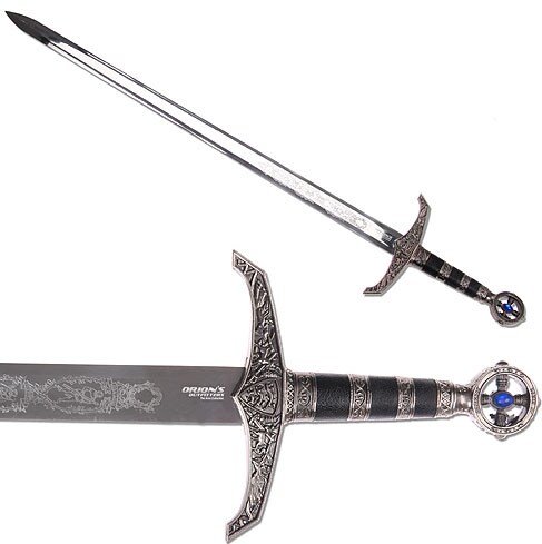 . For the shield, color it blue, without the emblem and with white edges, that start where the gold lines are to the edge of the shield. The sword will be much the same as in the reference picture except with a brown leather handle.