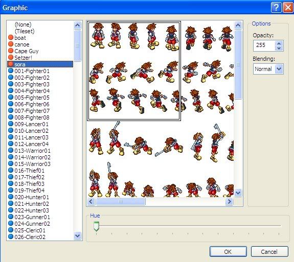 I'm tearing my hair out trying to figure out how to work character sets. I can get a great sprite sheet (for example, a PNG set of Sora or Setzer or something) online, but after I load it into the material base, the "square" that selects around the specific sprite (i.e. in choosing a graphic for an event, etc.) doesn't line up properly. For example: