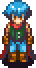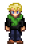 @Bluehazed: Needs more contrast and shading. Add a highlight color to the scarf (towel?) and darken the outline a bit, and I'd also probably add another shade to the shirt for smoothing. Try to define the shape of his body more; the armpits in particular look a little weird (darken them), and the shirt looks very baggy, although you might have been going for that. The shirt is also very dark; pick a lighter highlight shade and don't use pure black (although I can't tell if it is or not). Also, either add another highlight shade to the pants or make the current light shade lighter. Lastly, the hair. Add a little highlight to the individual clumps and use another dark color for more shading. As Grath said, about four colors tends to work well for large items; since the template has five colors, significantly fewer than that can look weird unless the item is small. You also might want to lift it from his skull more (I tend to put the minimum hair dimensions one pixel outside of the head outline), and the hairline should be lower. You also forgot to shade under it.